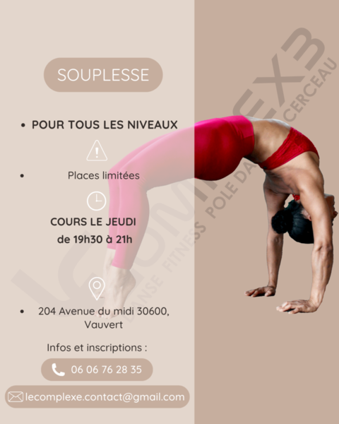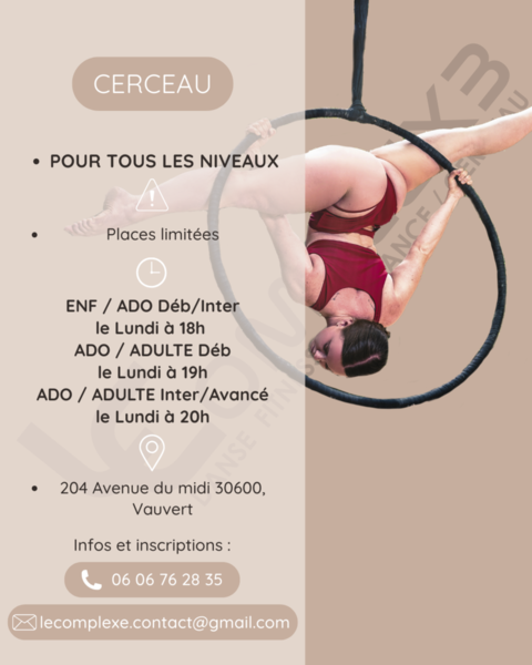 Bienvenue au Complexe, Danse, Fitness, Gym et Pole Dance / Cerceau. Que vous soyez sportif débutant ou confirmé, danseur amateur ou avancé, notre équipe vous aidera à atteindre tous vos objectifs sportifs ou artistiques. Idéalement situé à Vauvert entre Nîmes et Montpellier (à proximité de Beauvoisin, Aimargues, Codognan, Aubais, Générac, Saint-Gilles, Le Cailar, Gallician, Aubord, Uchaud, Bernis, Saint-Laurent-d'Aigouze, Vergèze, Gallargues, Aigues-Vives, Milhaud etc...), Le Complexe dispose de 3 salles dédiées à chacune de ses activités : DANSE, FITNESS et YOGA, POLE DANCE et CERCEAU.